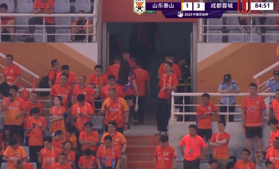 本场比赛,山东泰山一度扳平比分,但客场作战的成都蓉城再度将比分超出,随后又将领先优势扩大至两球。那是比赛第83分钟,部分泰山队球迷提前退场。