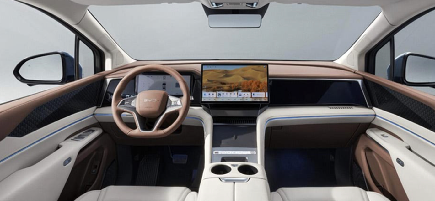 内饰采用了环抱式设计,方向盘中间的“夏”变成了“BYD”,仪表盘为内嵌式设计,配备了一块悬浮式中控屏。同样拥有手机无线充电、环绕式安全气囊、比亚迪3D智能座舱系统等配置。