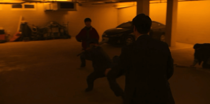镜头一转,基锡在地下车库被一群人围攻,对方手持凶器,来者不善。