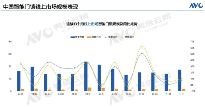 2025年5月,中国智能门锁线上市场(含传统电商及内容电商)稳中有增。其中,零售量同比增长8%,零售额同比增长10%。