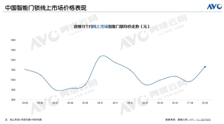 5月线上市场智能门锁均价为1131元,同比增长2.2%,环比今年4月增长15%。这主要得益于618年中大促提前带动了产品结构升级,中、高端产品销量提升,带动行业均价达到了2025年开年以来的月度最高值。价格段向上1500元及以上的中、高端市场转移。