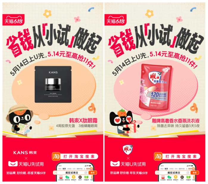 传统的品牌小样投放,品牌要借助营销机构,通过线上或线下渠道,将单个或组合小样投放给用户。天猫U先首创的“入仓”,让各品牌方将小样送入指定仓库,再由平台对仓内小样进行统筹管理和派发。平台会通过跨品类的“小样礼盒”等玩法,把小样种草、拉新、试水的效能进一步放大。“疯狂试用日”,就是U先为入仓小样创造的经典IP。