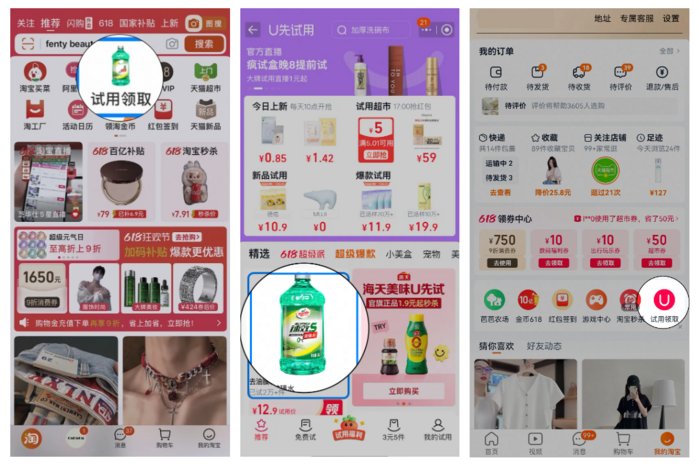 亿邦动力发现,部分用户在手淘首页看到的U先入口“变”了。“试用领取”不仅占据着搜索框下方各类入口的中心位置,曾经的统一红色U型袋图标也变成了千人千面的品类动态图标:有些用户看到的是一瓶玻璃水,有些用户看到的是一瓶精华液……