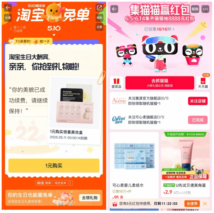 比如,U先和支付宝通过联合补贴提升人群渗透效率,触达支付宝中的高价值女性人群。而除了这类相对静态的场域,U先还在平台的周年庆礼物、大促叠猫猫等互动中进行了分发,在更大流量的活动中帮品牌识别和投放精准目标人群。