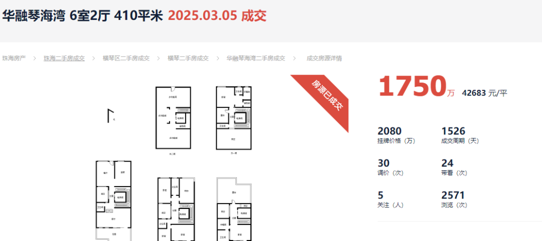 其中,珠海全城成交总价最高的一套房源即是横琴的华融琴海湾,成交总价约1750万元/㎡。