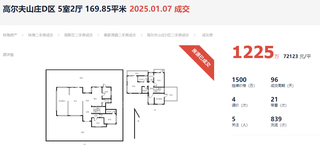 其中,珠海全城成交单价最高的一套房源即是高新区的高尔夫山庄D区,成交单价约7.21万元/㎡。