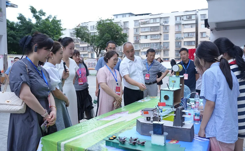 美术作品展区、科技发明展区、物理实验展区、计算机编程展区、非遗皮影戏展区、德育特色活动展区、艺体特色活动展区、劳动成果展区让区政协领导们一一驻足,滕主席和其他委员们还兴致勃勃地和孩子一起参与科学实验,并成功地完成实验操作,赢得了大家的阵阵掌声。