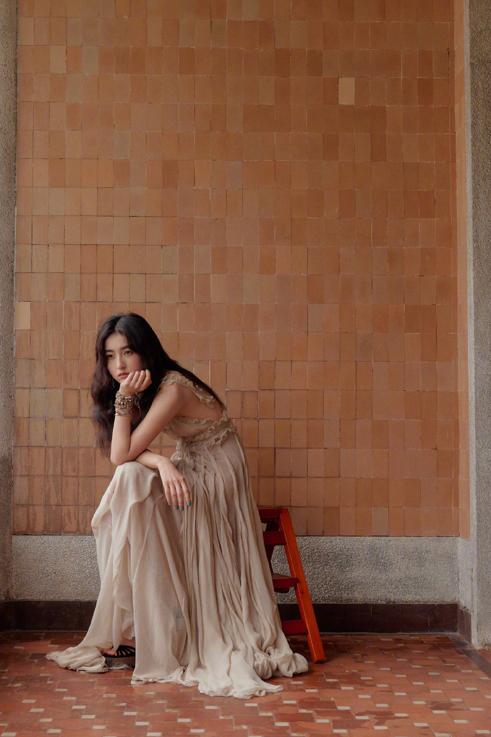 张子枫身穿裸色深V连衣裙,慵懒感满满