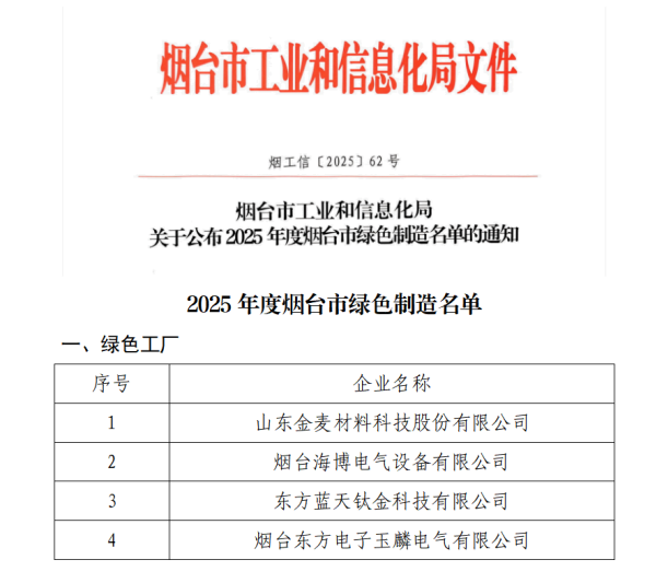 胶东在线6月23日讯(通讯员 郭健)6月17日,烟台市工业和信息化局公布了2025年度烟台市绿色制造名单,山东金麦材料科技股份有限公司、烟台海博电气设备有限公司、东方蓝天钛金科技有限公司、烟台东方电子玉麟电气有限公司4家企业获评烟台市绿色工厂,推荐获评率100%。截至目前,烟台高新区市级绿色工厂数量累计达到8家,取得较大突破。