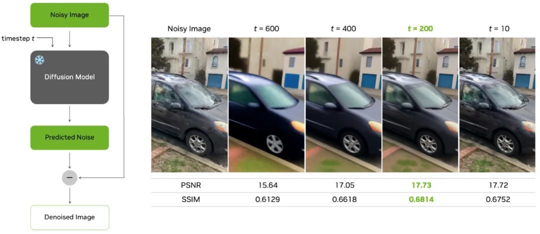 1. 单步扩散:发现渲染伪影的分布在 t=200 处最接近扩散模型训练数据,DIFIX 可一次去除伪影并保留语义结构。