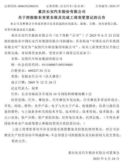 6月23日晚,重庆长安汽车股份有限公司发布公告称,公司控股股东“中国长安汽车集团有限公司”正式更名为“辰致汽车科技集团有限公司”,并已完成工商变更登记手续。这一消息迅速引发了行业的广泛关注,毕竟名称的变更往往预示着企业战略方向的重大调整。那么,此次更名背后究竟隐藏着怎样的深意?对长安汽车乃至整个汽车行业又将产生何种影响?