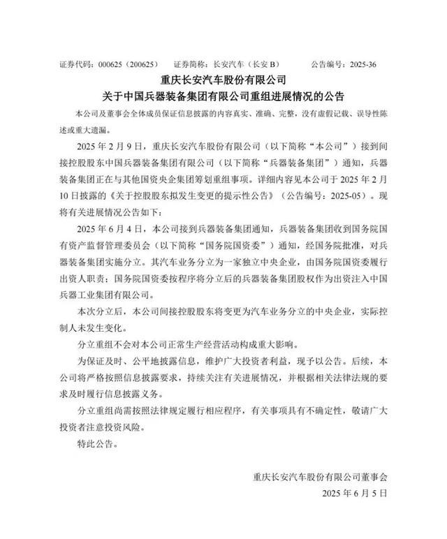 事实上,此次更名并非孤立事件。6 月 5 日,长安汽车曾公告,其间接控股股东中国兵器装备集团将实施分立。汽车业务将分立为一家独立中央企业,由国务院国资委直接履行出资人职责。国务院国资委将分立后的兵器装备集团股权作为出资注入中国兵器工业集团。这一调整意味着长安汽车背后的中国长安将不再隶属于兵装集团,而是成为与一汽、东风同级别的独立汽车央企。在这样的背景下,“辰致汽车科技集团” 的诞生就显得顺理成章了。