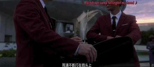 楼下的收音机里播放的是B·J·托马斯的歌曲:“雨滴不断打在我头上”《Raindrops keep falling on my head》。