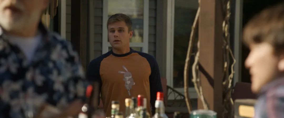 参加家庭聚会时,波比T恤上印着一只骑着弹簧跳跳机的兔子。
