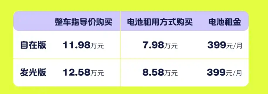 其中自在版起售价从11.98万元骤降至7.98万元,发光版则从12.58万元降至8.58万元,电池月租锁定399元。