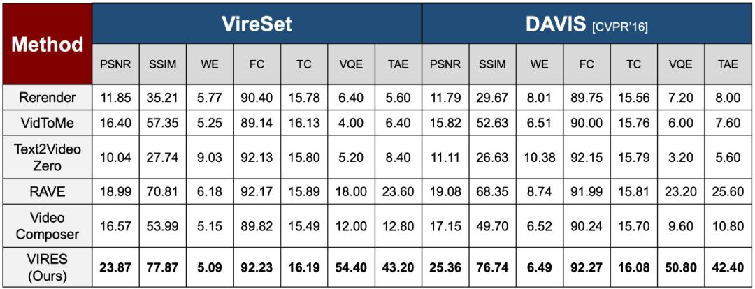 为了确保详细的比较,其不仅在 VireSet 数据集上进行测试,还在业内广泛使用的 DAVIS(CVPR’16)数据集上进行了测试。实验结果显示,VIRES 在客观评价指标:视觉感知质量(PSNR)、空间结构一致性(SSIM)、帧运动准确性(WE)、帧间一致性(FC)和文本描述一致性(TC)方面均取得了最佳结果。