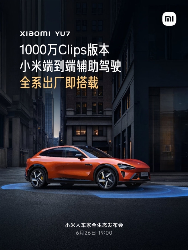 按照雷军的说法,全新1000Clips版本,小米YU7全系出厂即搭载;小米SU7 预计7月下旬升级。