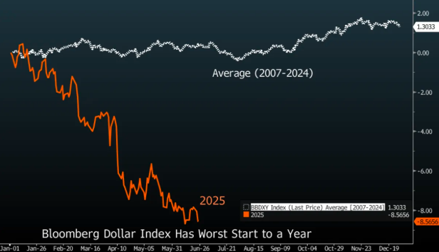 随着2025年上半年临近落幕,若让投资者对全球市场过去六个月最令人印象深刻的行情进行一番盘点,相信呈“自由落体式”下跌的美元也足以在其中占据一席之地……
