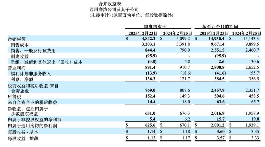 2025财年第三季度(截至2025年2月23日止的三个月),通用磨坊净销售额为48亿美元,同比下滑5%,其中中国市场净销售额同比下滑3%;净利润为6.26亿美元,同比下滑7%。该财季数据发布后,股价当天下跌超2%,报59.215美元。
