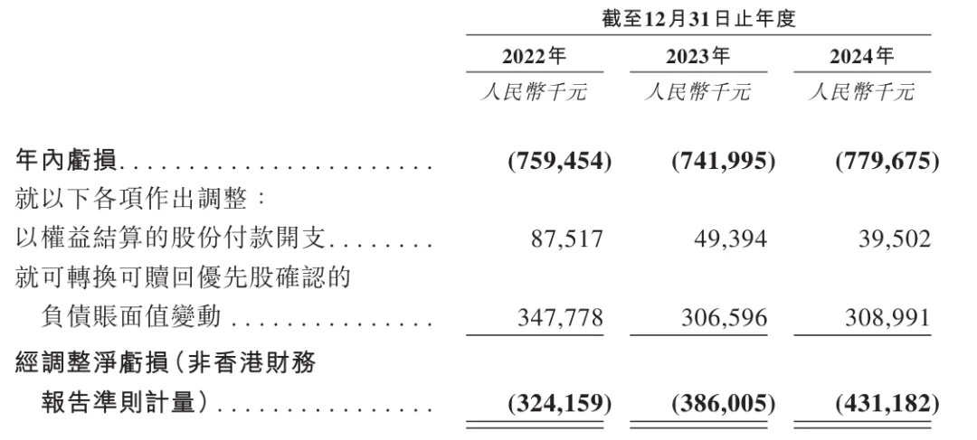 镁伽科技2022年、2023年、2024年经调整净亏损分别为3.24亿元、3.86亿元、4.31亿元。
