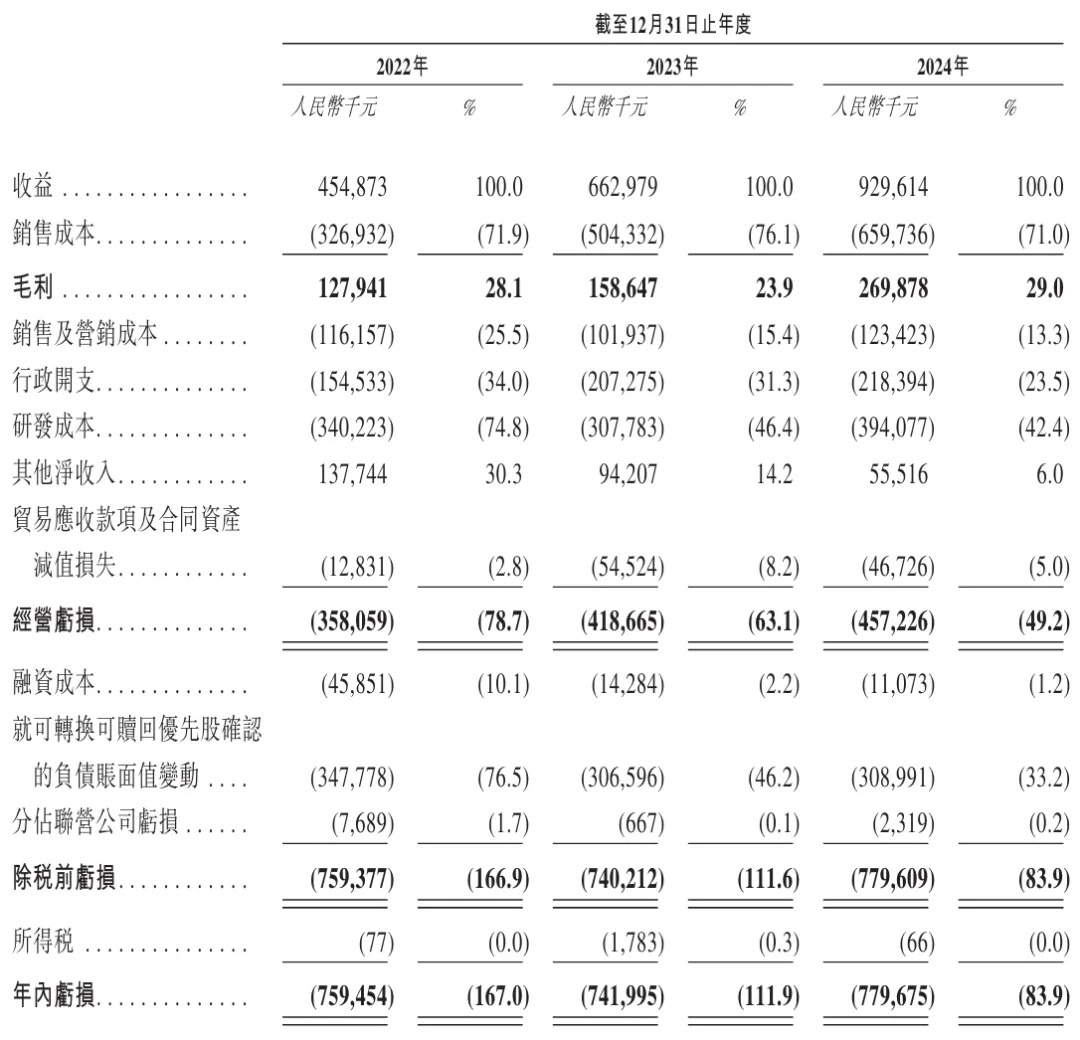 镁伽科技2022年、2023年、2024年年内亏损分别为7.59亿元、7.42亿元、7.8亿元;年内利润率分别为-167%、-111.9%、-83.9%。