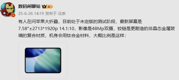 【CNMO科技消息】近日,有数码博主透露了苹果首款折叠屏iPhone的最新屏幕规格。据爆料,该设备目前处于未定版的测试阶段,内屏尺寸约为7.58英寸,分辨率达2713×1920像素,屏幕比例为14.1:10。这一数据较早期爆料(如2025年4月的7.76英寸)有所调整,表明苹果在测试中正优化屏幕尺寸以提升便携性和用户体验。