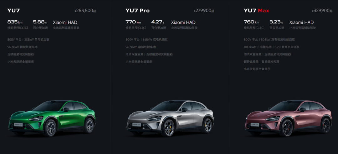 续航方面,YU7提供了磷酸铁锂和三元锂两种选择,标准版CLTC续航高达835公里,Pro版和Max版也分别达到770公里和760公里,实际表现值得期待。