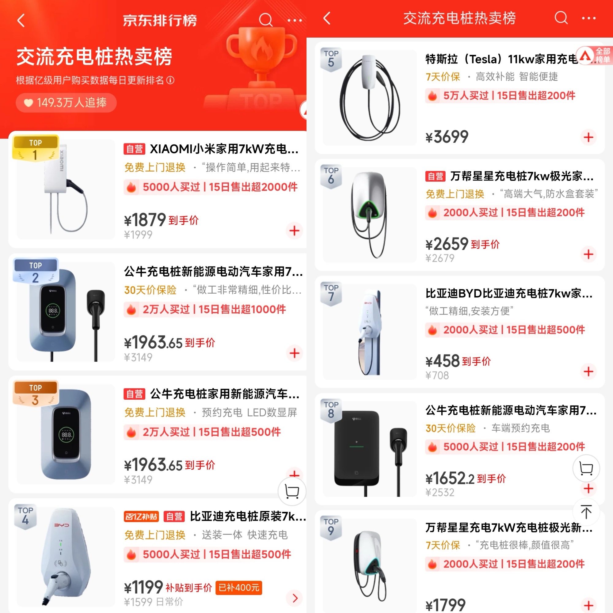 根据京东发布的交流充电桩热卖榜,销量前三名的小米充电桩和公牛充电桩,价格均在 1800-2000 元这一范围内,而价格更高的特斯拉的 11kW 充电桩、万帮星星 7kW 充电桩紧随其后。
