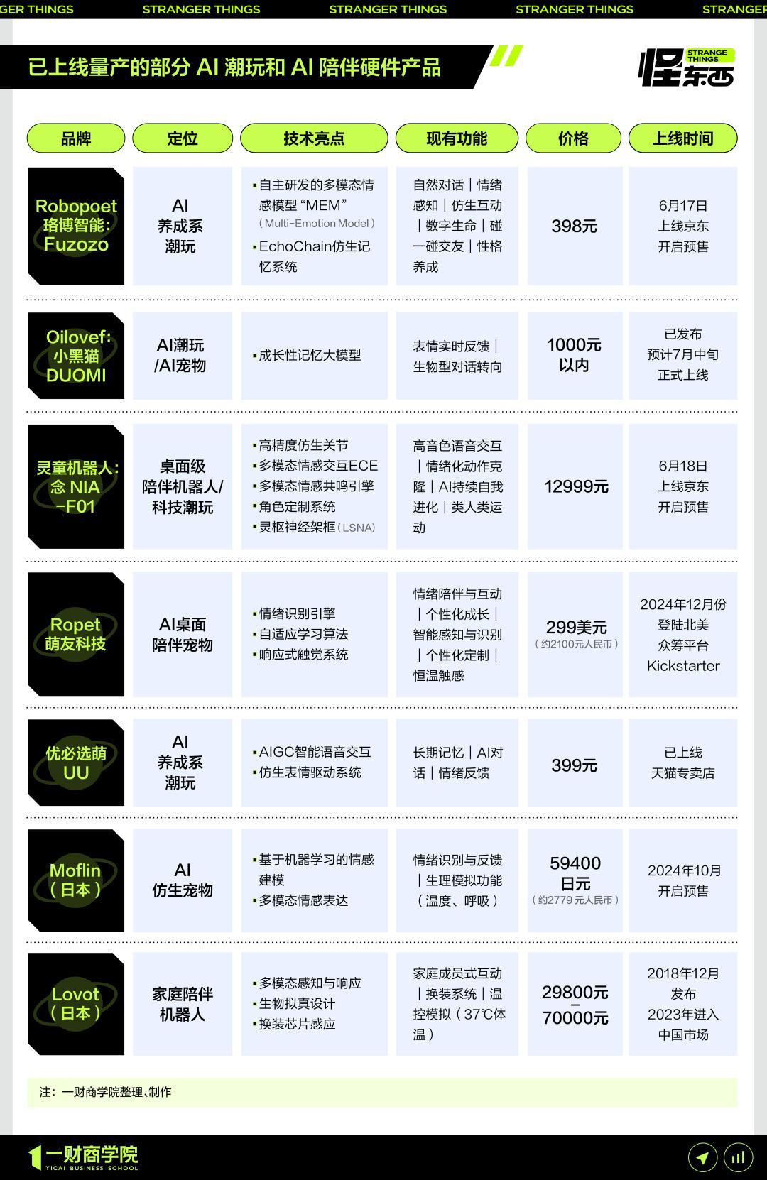一财商学院整理了目前市面上火爆并且已量产上市的7款AI陪伴硬件,发现无论产品定位是AI宠物、陪伴机器人还是最近出现的AI潮玩,都多多少少借鉴了潮玩和二级市场的营销打法。