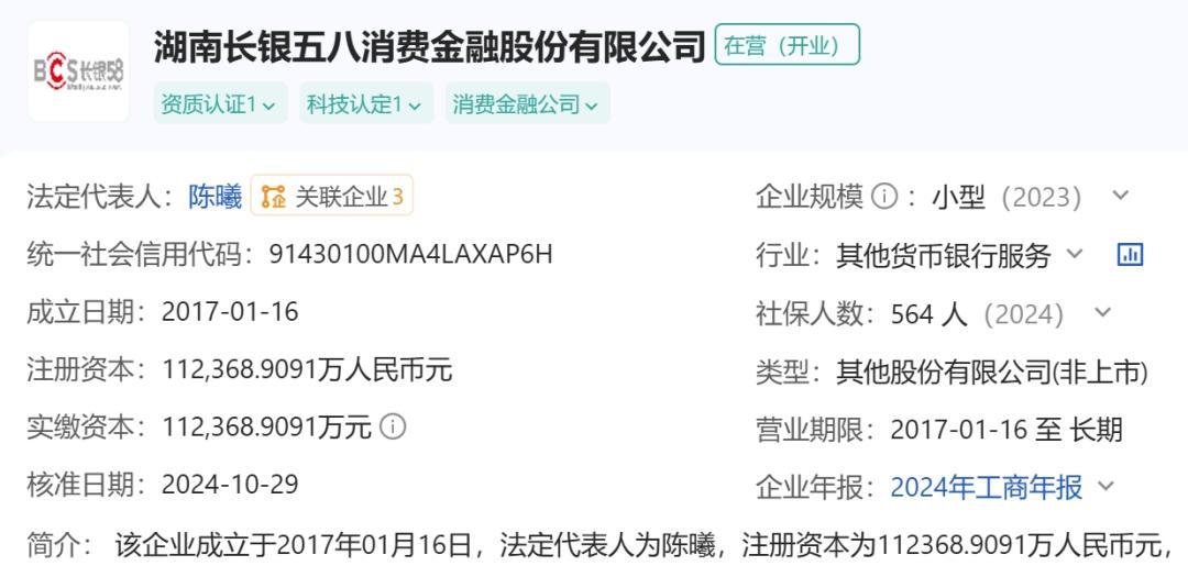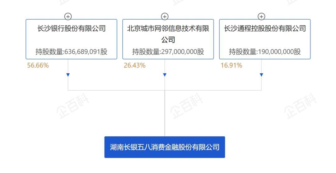 作为湖南省首家持牌消金机构,长银五八消金的股权结构变更为长沙银行持股56.66%。