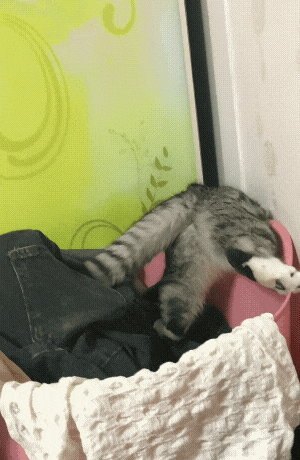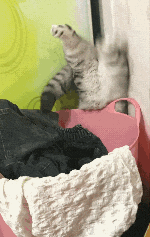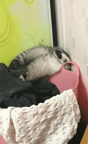 这只小胖猫,放着好好的猫窝不睡,非要去挑战脏衣筐。