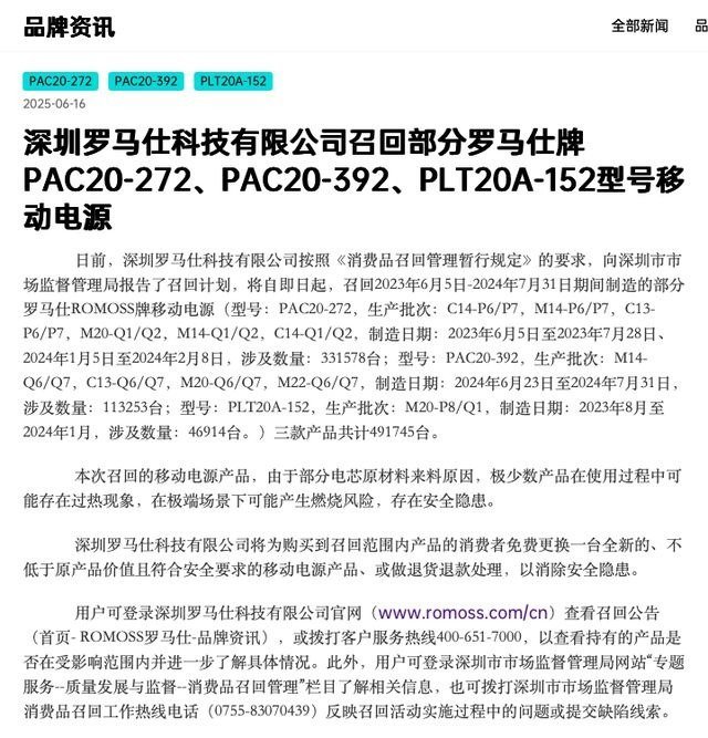 罗马仕后续发布公告,官宣召回部分型号的部分批次的充电宝,因为部分电芯原材料等原因,极少数产品在使用过程中可能会过热。罗马仕召回和被取消3C认证这件事情,已经引起了连锁反应。