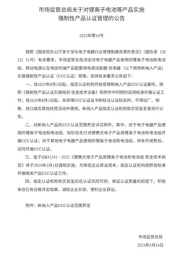 移动电源被纳入3C认证目录可追溯到2023年。市场监管总局发布关于对锂离子电池等产品实施强制性产品认证管理的公告,自2023年8月1日起对锂离子电池和电池组、移动电源实施CCC认证管理。自2024年8月1日起,未获得CCC认证证书和标注认证标志的,不得出厂、销售、进口或在其他经营活动中使用。