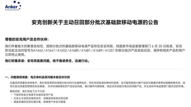 接下来安克创新也发出公告:部分批次的锂离子电池存在未经批准的原材料变更,这可能导致极少数产品在长期循环使用后隔膜绝缘失效,进而引发过热甚至燃烧的安全隐患,需要召回部分批次型号的充电宝。