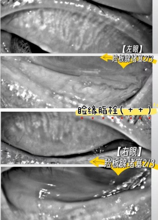 66岁的邱先生曾被双眼干涩、异物感折磨两个月,严重影响生活。就医检查发现,他睑缘充血,超三分之二的睑板腺开口堵塞并伴有脂栓,确诊为双眼睑板腺功能障碍。