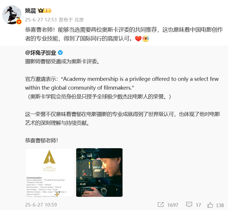 坏兔子影业官博晒图写道:摄影师曹郁受邀成为奥斯卡评委。官方邀请表示:“Academy membership is a privilege offered to only a select few within the global community of filmmakers.”(奥斯卡学院会员身份是只授予全球极少数杰出电影人的荣誉。)这一荣誉不仅意味着曹郁在电影摄影的专业成就得到了世界级认可,也体现了他对电影艺术的深刻理解与持续贡献。恭喜曹郁老师!