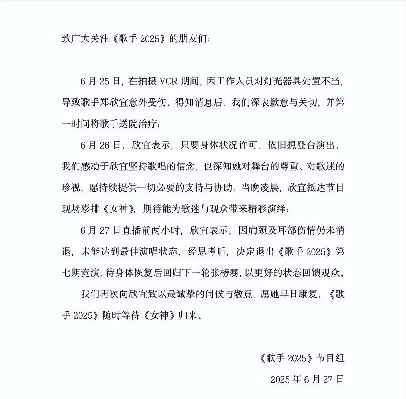 6月25日,在拍摄VCR期间,因工作人员对灯光器具处置不当导致歌手郑欣宜意外受伤,得知消息后,我们深表歉意与关切,并第一时间将歌手送院治疗。