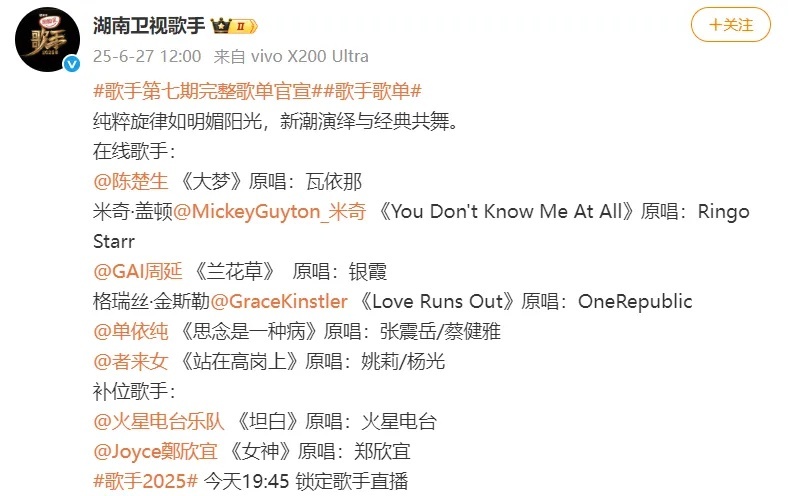 6月27日晚,《歌手2025》第七期播出,米奇·盖顿首次拿到第一名。本场竞演排名如下: