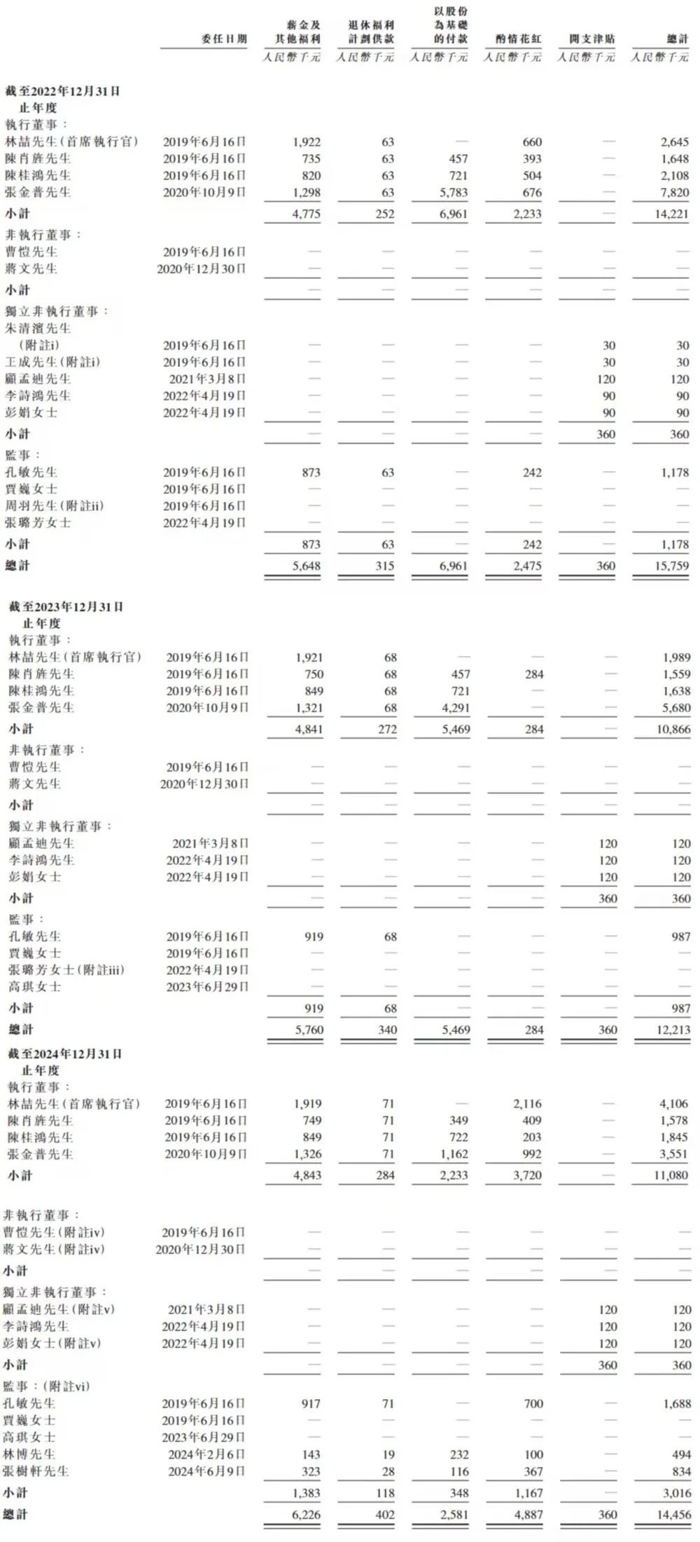 2022年-2024年,商米科技的高管、董事和监事以薪金、花红、股份等形式,分别领取了1576万、1221万和1446万的薪酬。