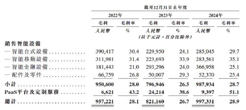 商米科技的商业物联网设备主要由OEM、ODM厂商代工,因此销售成本较高。2022年-2024年,其销售成本分别为24.5亿元、22.5亿元和24.6亿元。