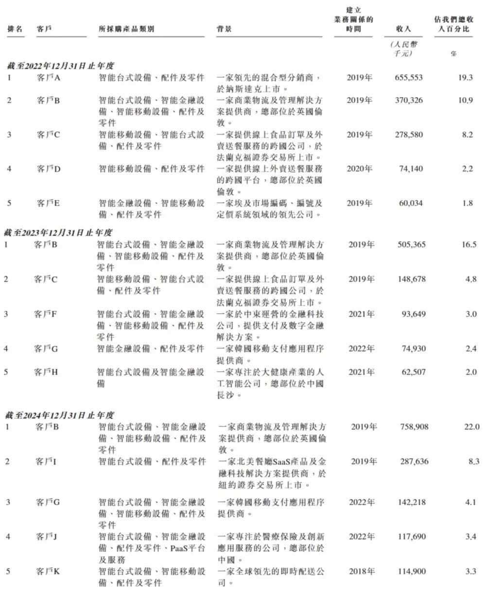 商米科技向超过200个国家及地区的客户销售商业物联网解决方案。2022年、2023年及2024年,该公司分别有2506名、2337名及2262名客户。