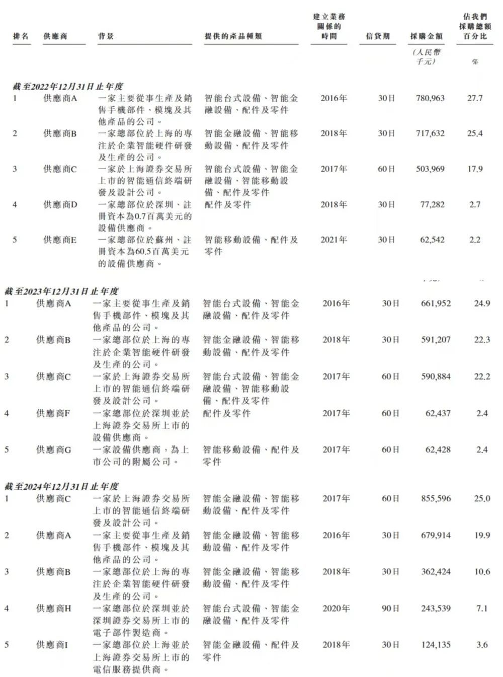 2022年-2024年,商米科技向前五大供应商的采购额分别为人民币21.4亿元、19.7亿元和22.7亿元,分别占对应年度采购总额的75.9%、74.1%及66.3%;来自最大供应商的采购额分别为7.8亿元、6.6亿元及8.6亿元,分别占采购总额的27.7%、24.9%及25.0%。