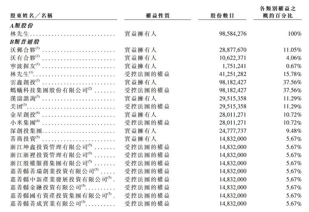 在商米科技的B类普通股中,蚂蚁集团的持股比例达37.56%,美团的持股比例为11.29%、小米的持股比例为10.72%、深创投的持股比例为9.48%。