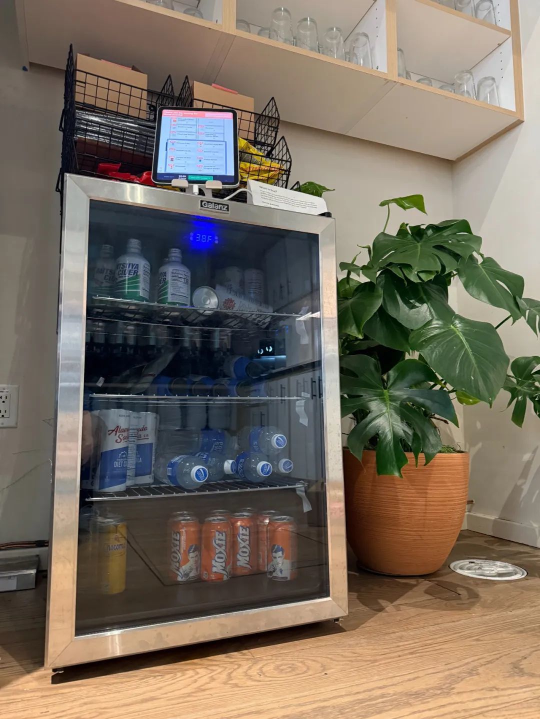 也就是说,Claude 不仅仅是管理一台自动售货机,它还必须完成许多涉及商店盈利的复杂任务:维护库存、设定价格、避免破产等等。下图是这个「商店」的样子:一台小冰箱,顶部放着一些可堆叠的购物篮,以及一台用于自助结账的 iPad。
