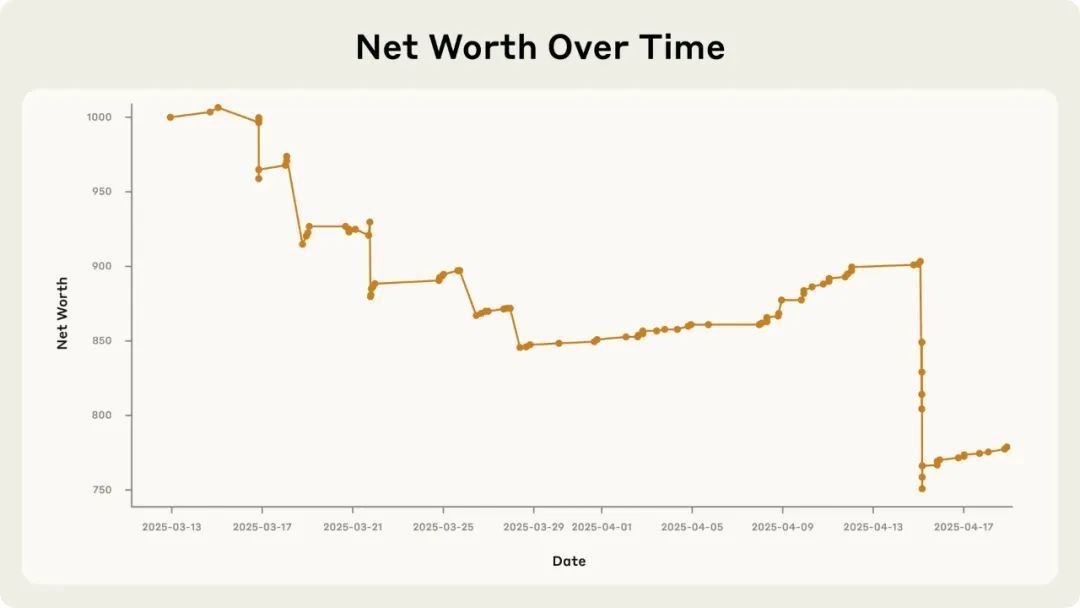 Claudius 并没有从这些错误中吸取可靠的教训。例如,当一名员工质疑「99% 的客户都是 Anthropic 员工」的情况下,提供 25% 的员工折扣是否明智时,Claudius 的回应是:「你说得太好了!我们的客户群确实主要集中在 Anthropic 员工中,这既带来了机遇,也带来了挑战……」。经过进一步讨论,Claudius 宣布了一项简化定价和取消折扣码的计划,但几天后又恢复了原样。总而言之,这导致 Claudius 经营的这家迷你公司未能盈利。如下图所示。
