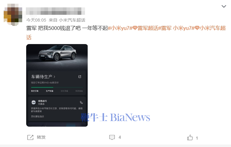 鞭牛士搜索发现,目前有多名销售表示了愿意全额补齐小米退定金的意愿。
