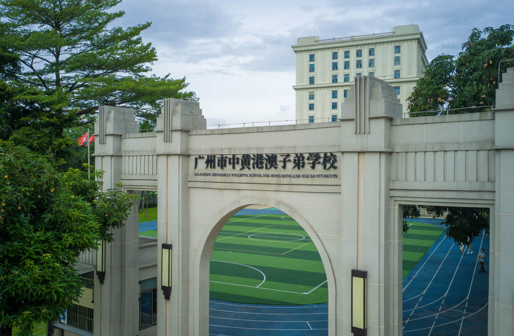 ↑图为6月19日拍摄的广州市中黄港澳子弟学校操场(无人机照片)。新华社记者肖恩楠摄