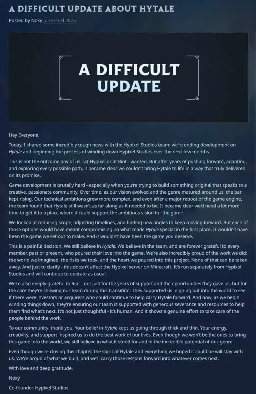 Hypixel Studios创始人Noxy在告别信中提到,团队在经过多年的努力推进、不断调整并探索了每一条可能的路径后,他们清晰地认识到,团队无法以一种真正兑现其承诺的方式将《Hytale》呈现给玩家。