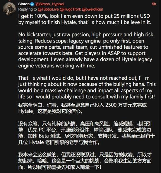 Hypixel Studios创始人Simon在社交媒体上称,他正考虑出资2500万美元回购《Hytale》的IP及相关资产。不过他也表示这是一个巨大的挑战,可能需要先跟家人仔细商量一下。而知名独立游戏发行商Devolver Digital及《Vintage Story》创始人也对此次回购表示感兴趣。
