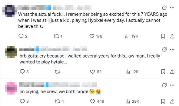 此后每隔一段时间,Hypixel工作室都会公布项目的最新进展,以及他们对于这款游戏的未来规划。直到今年6月24日,他们突然宣布由于缺乏后续投资,《Hytale》将会在未来几个月内停止开发,并开始逐步关闭Hypixel Studios。